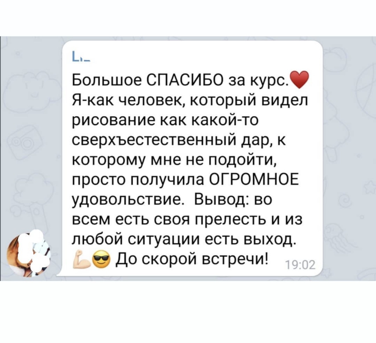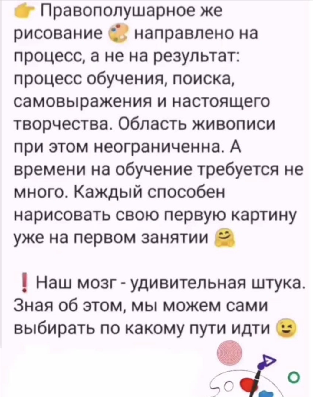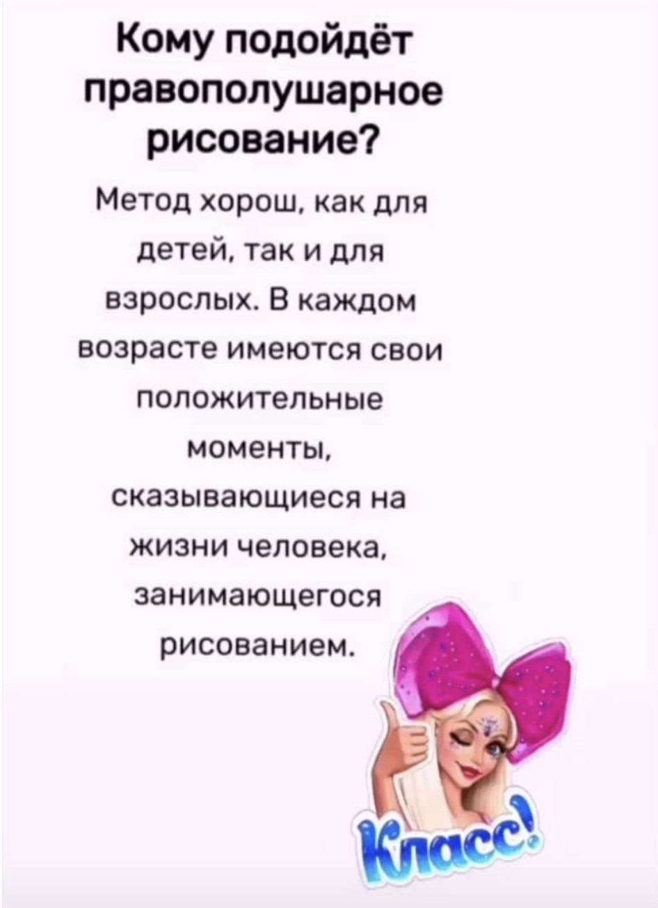 Моё стремление к познанию прекрасного привело к правополушарному рисованию.Что это такое, я впервые узнала в 2019, мне было 50 лет, и с тех пор моя жизнь стала меняться.В лучшую сторону.По всем направлениям).Желание делиться знаниями и опыт работы педагогом сделали свое дело.Родился небольшой онлайн- курс для таких же, начинающих, как и я.Раз у меня получилось, у вас точно получится.Правда, если вам самими это нужно.Так, у меня прошло обучение на 2 потоках онлайн и много индивидуальных занятий.Интересный факт: возраст учеников был от 8 до 72 лет).