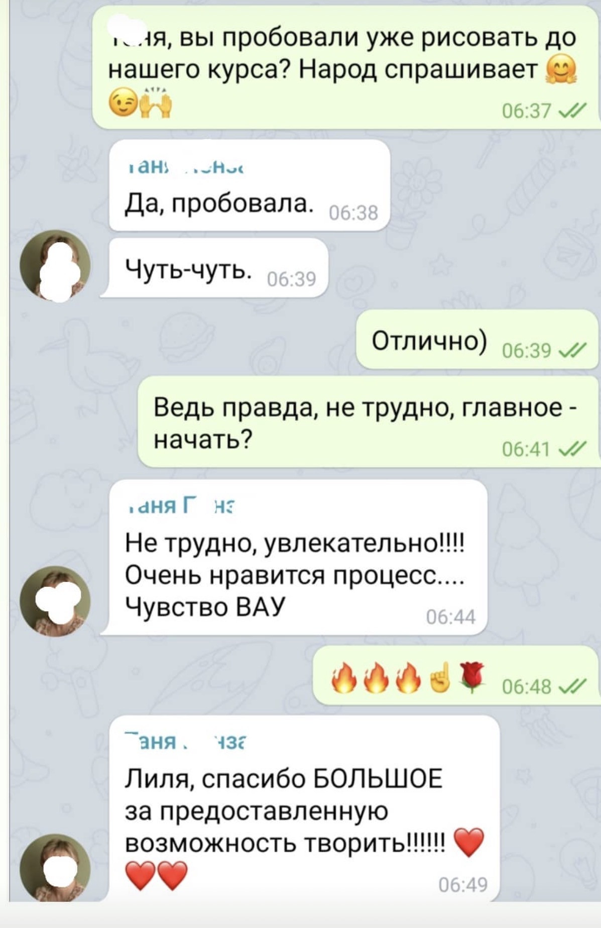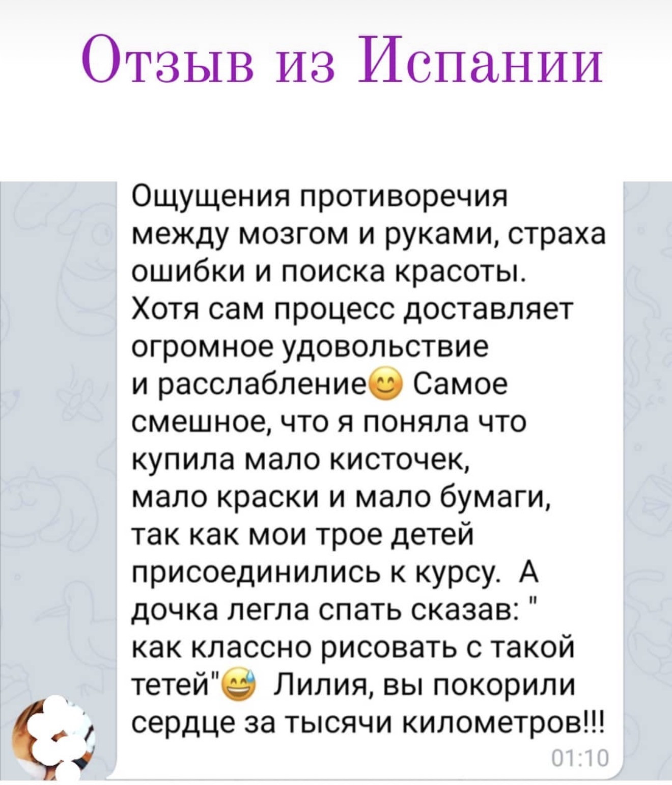 Вот некоторые отзывы участников онлайн-курса, нашла в архиве 2021года. Но, эмоции и энергия чувств моих учениц до сих пор согревает душу.Многие из них пошли в дальнейшее развитие в разных видах творчества.С кем-то мы так и общаемся в переписке.Ясно одно: равнодушных людей среди нас нет)